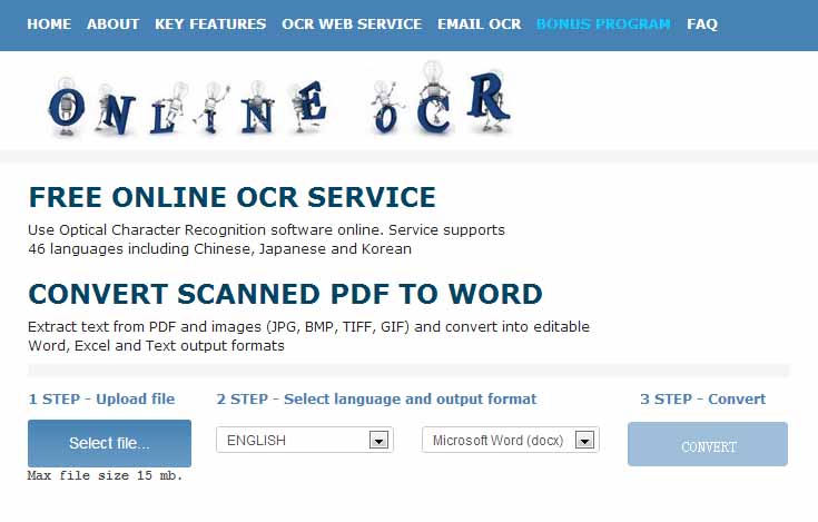 Another can't be missed online provider is i2OCR. Personally, I prefer using this free PDF OCR converter, since it has no sign up requirement and no limitation of imported file size. i2OCR helps convert scanned receipts, contracts, pix, faxes, screenshots, etc. to Word, Web and others, so the extracted texts and characters would be able to edited, formatted, or translated.