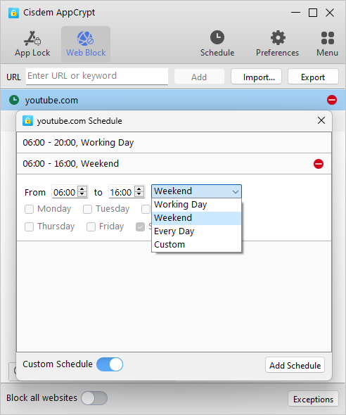 To do so, click the YouTube site under the Web Block tab. Then click the clock icon that appears, which will open the Custom Schedule dialog. In the dialog, turn on Custom Schedule. Click Add Schedule. Click the existing schedule to edit it. You can add more schedules if needed. For example, you can set different schedules for weekdays and weekends, allowing more YouTube time on weekends.