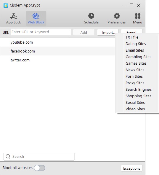 In addition to youtube.com, there are many video websites designed to be addictive, especially some short-form video platforms. In step 6, you can click the Import menu and choose Video Sites, which will automatically add YouTube and tons of other video websites to the block list.