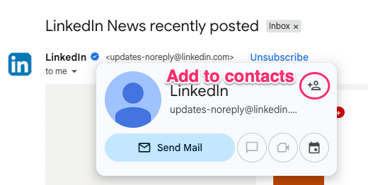 It's very easy to do. In your Gmail, open an email of your choice. Hover your mouse on the sender's name until you see a dialog. In the dialog that appears, click the Add to contacts icon.