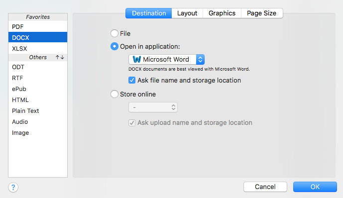 - Export as PDF, DOCX, XLSX, ODT, ePub, Audio, RTF, HTML, TXT and Image;