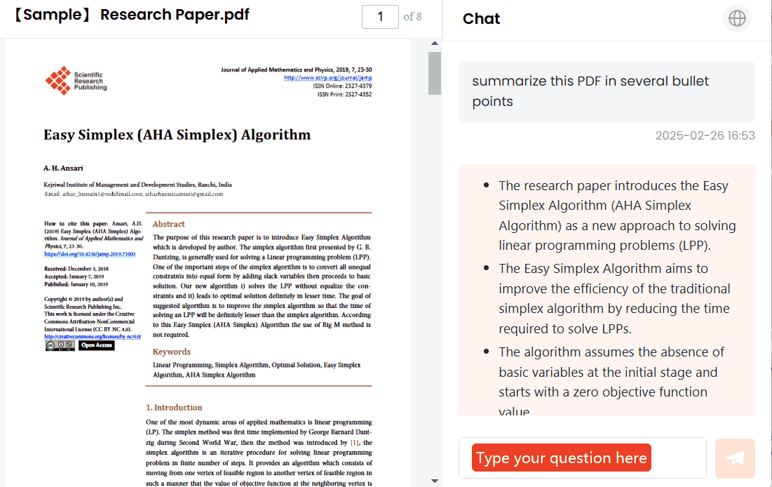- Smart Interaction with PDF: It provides a chat interface for users to ask any questions about uploaded PDF documents, and you will receive content-aware answers.